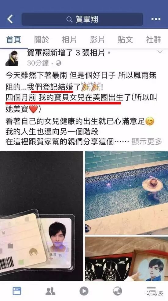 今天白天,贺军翔突然在脸书上自爆已经结婚生女的消息。