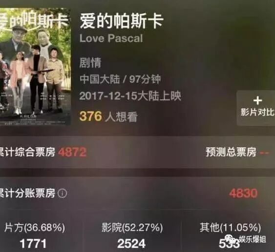 这部电影从上映到被下映,累计总票房4872元,电影院分得了2524元,片方分得了1771元,其他533元,真是太少了,少的可怜人!这些钱估计都不够给剧组分发盒饭的!