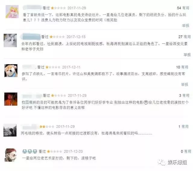 可是翻翻该片的豆瓣评分,看过校园点映的不少网友,给了一星的评分,而且这一星还多数都是冲着两位老戏骨给的,要不然,都想“负分滚粗”了。
