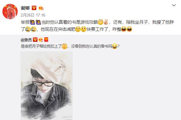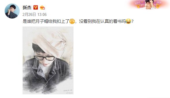 26日张杰发微博称:是谁把月子帽给我扣上了,没看到我在认真看书吗?