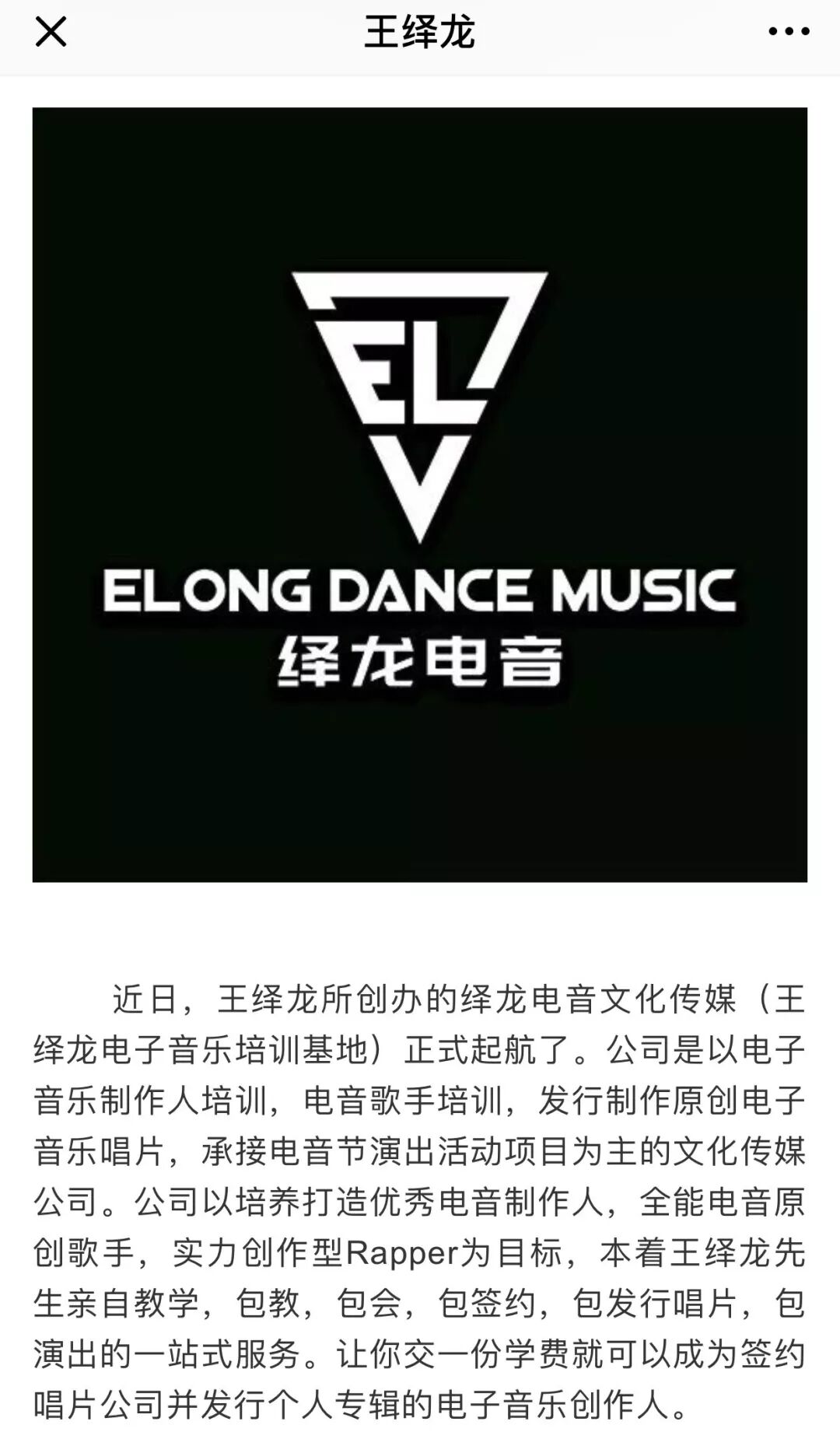 不仅如此。在王绎龙的培训项目中,他用到的中文原名为“绎龙电音”。但是引人哄堂大笑的是,对应的英文名竟又是“Elong Dance Music”。这么说起来,王绎龙可能早就已经把Electronic Music与Dance Music划等号,压根不明白电音与舞曲之间的定义有不尽相同之处。毕竟王绎龙前几年才刚刚走出“DJ舞曲”的土嗨领域嘛。如此混淆概念,再次让人怀疑王绎龙的专业性。
