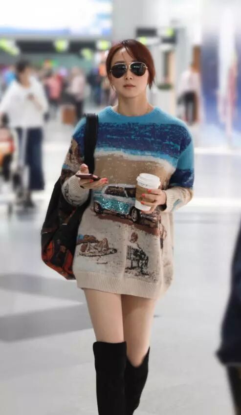 这天,胡静身穿蓝白变色的毛衣,上边有卡通图案装饰,趣味统统,ovesize的计划显得整个人特殊的苗条娇小,搭配黑色长筒靴遮腿,很是大胆,秀出细长笔直的美腿,十分性感。