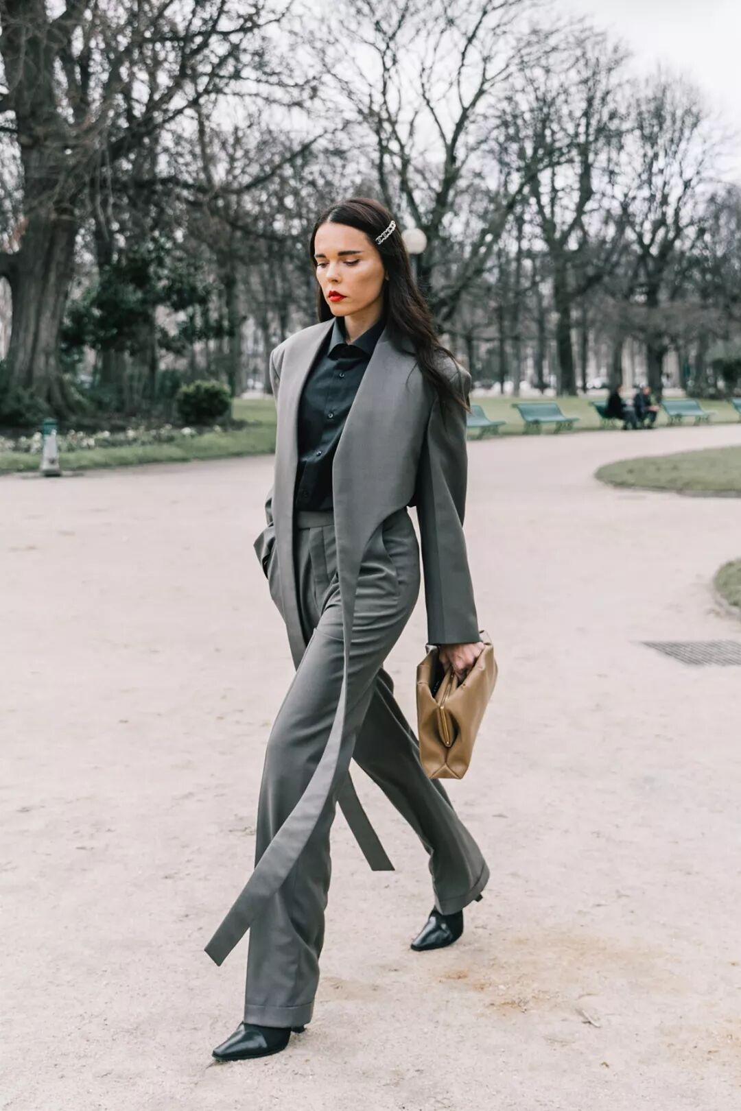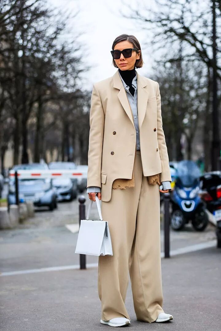 如果职业女性不想穿得过于拘谨,可以选择帅气又潇洒的阔腿裤来搭配,既不老气还显得非常时髦。
