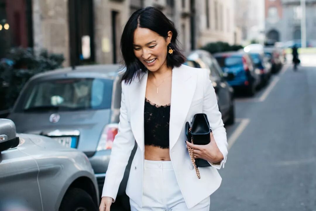 或者像下面这样穿,性感的蕾丝裹胸,外面是干净利落的白色套装,又一个娘man平衡的典范。