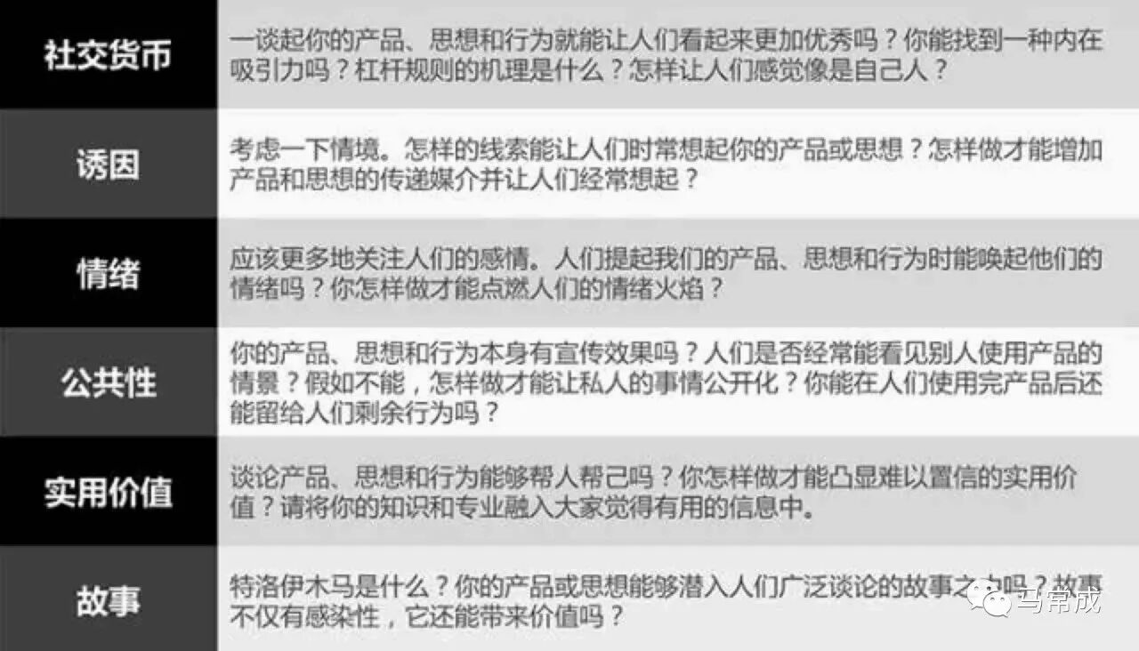 社会影响依赖于口头传播,而口头传播要达到疯传的效果需要具备强大感染力,作者乔纳·伯杰经过大量的实验论证,总结出了使传播具有感染力的六大原则:社交货币、诱因、情绪、公共性、实用价值和故事。
