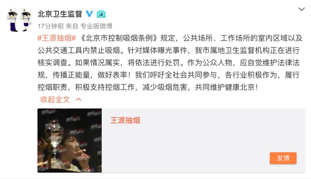 《北京市控制吸烟条例》规定,公共场所、工作场所的室内区域以及公共交通工具内禁止吸烟。针对媒体曝光事件,我市属地卫生监督机构正在进行核实调查。如果情况属实,将依法进行处罚。作为公众人物,应自觉维护法律法规,传播正能量,做好表率!我们呼吁全社会共同参与,各行业积极作为,履行控烟职责,积极支持控烟工作,减少吸烟危害,共同维护健康北京!