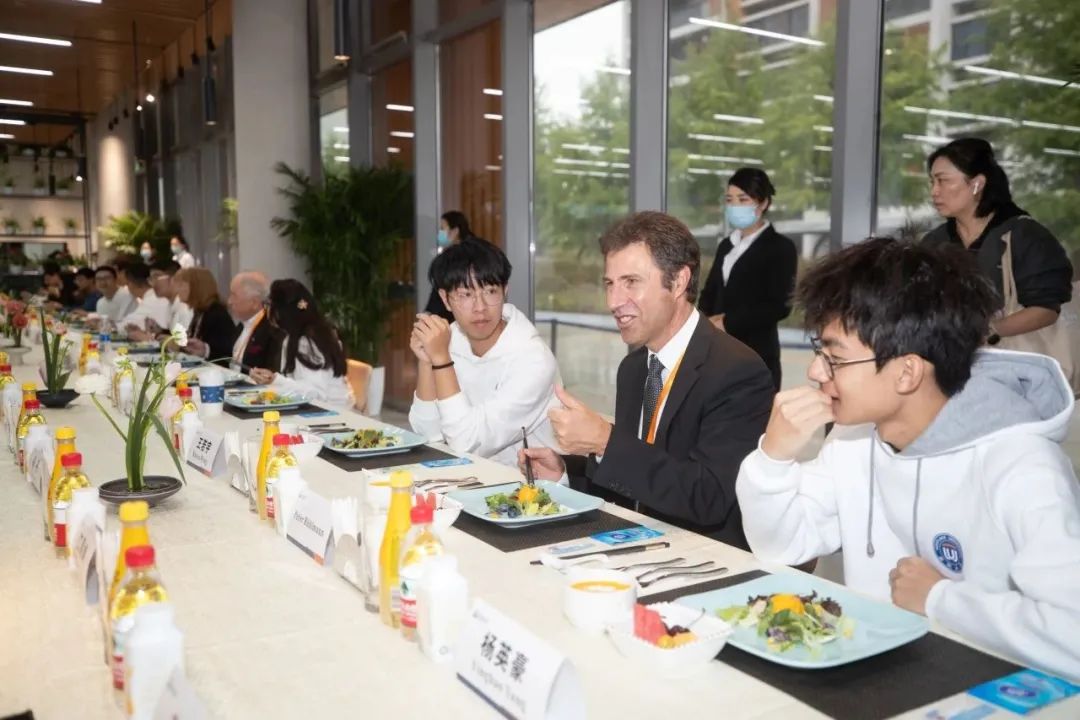 就像Nicole所说,一流科研训练是西湖大学本科生的核心培养理念之一。不少同学在上午的讲座现场没有抢到提问机会,趁着这顿饭的时间抓紧问了起来。
