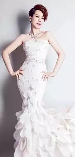 一身白色的抹胸连衣裙像是美人鱼一般,优雅精致,修身的设计尽显完美身姿,玲珑有致的身材很有诱惑力,鱼尾裙摆的设计柔美典雅,时尚满满。