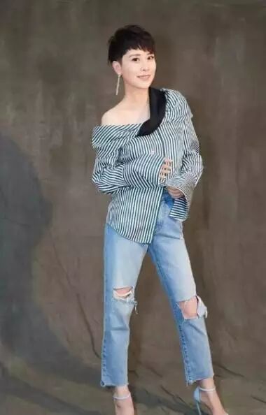 性感十足的衬衫露单肩的穿法很时尚,精致的锁骨尽展个性,干练的短发不加太多的修饰很精致迷人,搭配破洞牛仔裤帅气满分很新潮。