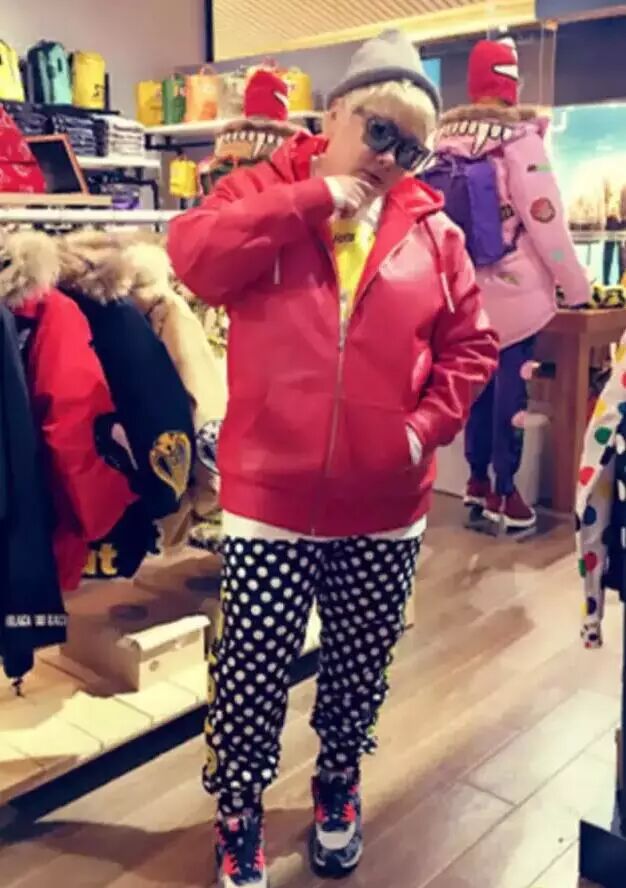 风格要不要差这么大!俏皮的线帽,大红色的卫衣搭配波点的裤子,还有潮人标配的挡脸墨镜,还有这屌屌的pose,感觉what's up,man马上就要脱口而出,接下来马上开始rap:hi,欢迎来到我的地盘布鲁克林,yo!yo!