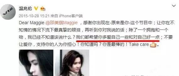 温兆伦在之后更是在微博道出心声,希望邵美琪能“多爱自己一些和对自己好一点”~
