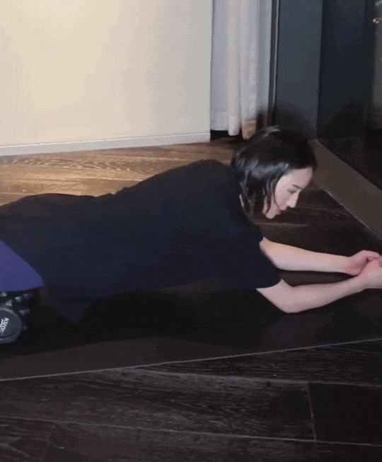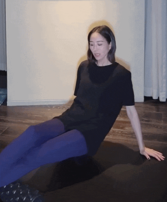 运动达人张钧甯的拉筋动作主打一个放松,首先准备一个滚轮,放松拉筋时以横向位进行,把滚轮横放至小腿下侧,先将左腿小腿放置滚轮上,右腿交叠至左腿上加压,双手支撑在地,臀部抬起,左右晃动滚轮,做到右侧时变换位置即可。