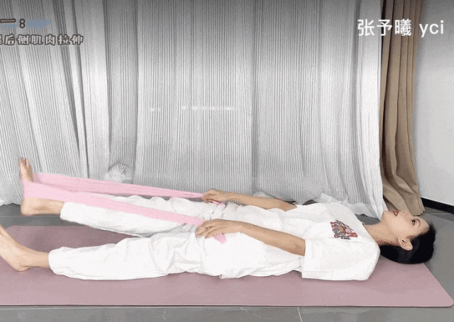 张予曦的拉伸不仅能让久站的腿变轻松,还能使双腿变纤细。开始拉伸前要准备好弹力带和瑜伽垫,首先将弹力带放置脚掌中心,平躺绷直向上抬腿,与身体呈90°,反复进行5次后保持静止,持续30s,同时要尽可能地向身体侧拉紧,这样可以使大腿根部的肌肉得到拉伸,换到右侧做同样的动作。