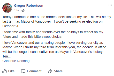 昨天,温哥华市长罗品信宣布了他“一生中最难的决定”——他决定不再参加10月20日的市长大选。