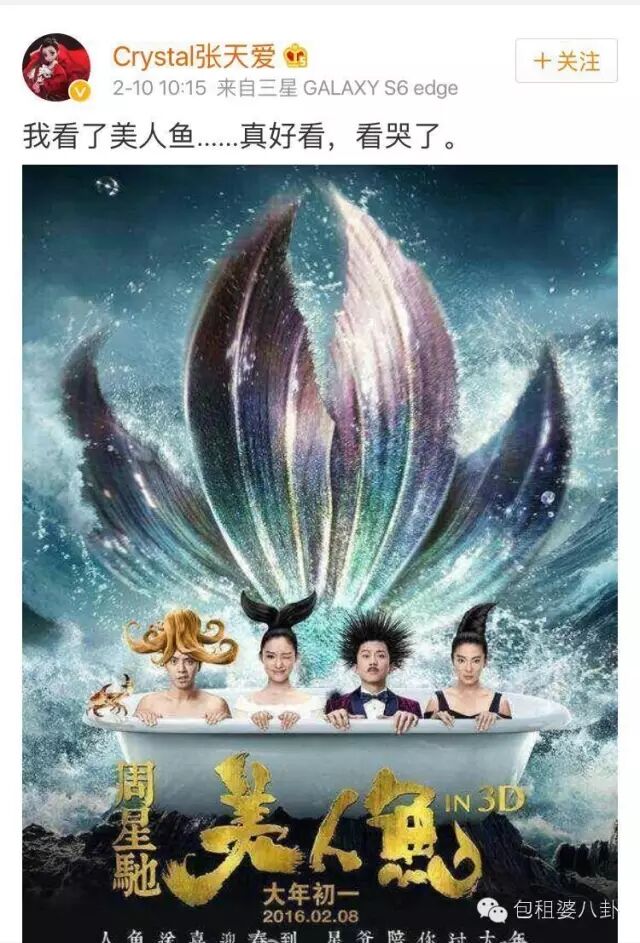 2月11日,张天爱看完《美人鱼》发微博说自己看哭了……