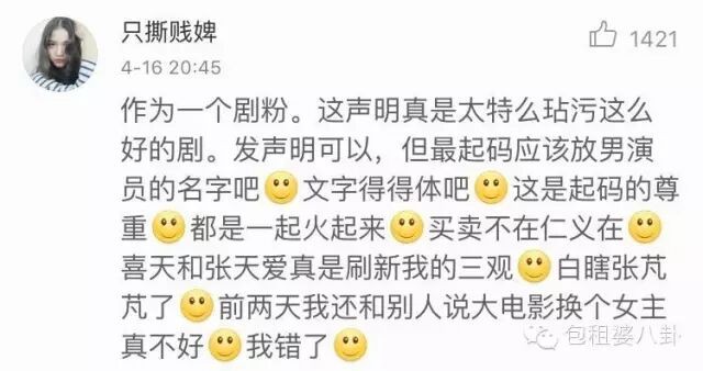 所以就不意外接下来张天爱为公司的声明点赞的举动了!