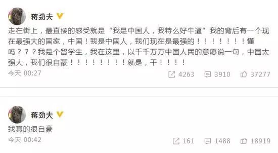 网易娱乐5月25日报道 5月25日凌晨,在日本留学的蒋劲夫发文:“走在街上,最直接的感受就是“我是中国人,我特么好牛逼”我的背后有一个现在最强大的国家,中国!我是中国人,我们现在是最强的!!!!!!!懂吗???我是个留学生,我在这里,以千千万万中国人民的意愿说一句,中国太强大,我们很自豪!!!!!!!!就是,干!!!! ” 、