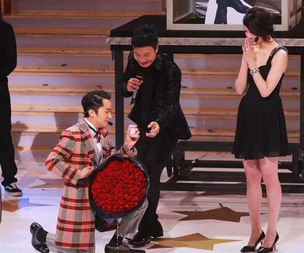 2014年11月19日,香港TVB台庆现场,这对小情侣被安排表演魔术。此时,背景音乐变成《跌入凡间的天使》,王祖蓝手捧玫瑰出场,突然下跪,拿出钻戒向女友求婚。李亚男喜极而泣,面对司仪的提问时,开心地回答:我愿意!