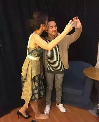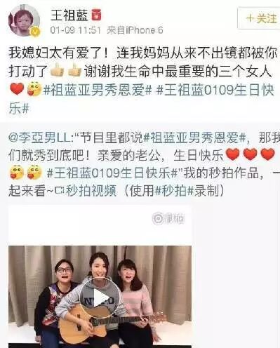 2016年1月7日,王祖蓝po出与妻子的自拍照,妻子李亚男为减少与王祖蓝的身高差,将高跟鞋脱在一边,网友纷纷点赞,夸妻子体贴懂事。