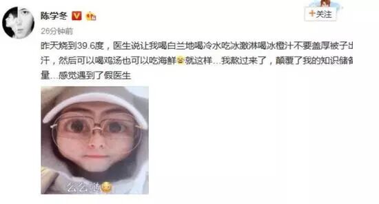 2月10日,陈学冬晒图发文:“昨天烧到39.6度,医生说让我喝白兰地喝冷水吃冰激淋喝冰橙汁不要盖厚被子出汗,然后可以喝鸡汤也可以吃海鲜就这样…我熬过来了,颠覆了我的知识储备量…感觉遇到了假医生。”照片中,陈学冬戴着帽子和大框眼镜,加特效后看上去萌萌哒。对此,粉丝纷纷提醒道:“能说这个段子怕是脑子烧糊涂了!”