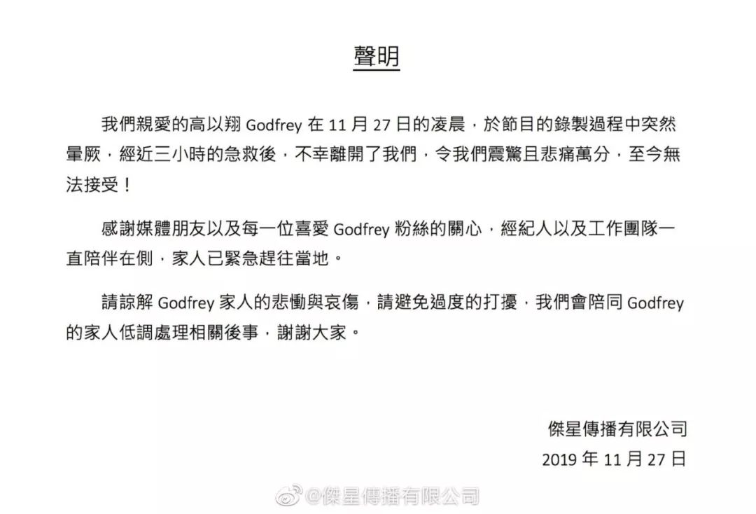 高以翔去世,至今无人道歉 吐槽电影院 港台男星 2019-11-27 22:28:57 400 创作不易,用心坚持,欢迎请BaGua喝几杯爱心咖啡!打赏并支持本文 打赏并删除本文 直到打出这些文字的时候,院长还不愿相信这个消息——高以翔心源性猝死,年仅35岁。从最早消息曝光到官方宣布逝世,不到12小时。我们几乎眼睁睁看着一条鲜活的生命渐行渐远。而爱他的人的心,也一点点被碾磨成灰。那么温柔的一个人,就这样走了。人间再也无法遇见王沥川。消息最早传出是在今天凌晨两点多,有网友发出朋友圈爆料,称《追我吧》节目现场有人晕倒,做了心肺复苏但人一直没有醒过来。凌晨三点半,某娱乐博主跟进,说高以翔情况很严重。五点半,他再次发布微博,直接点了一支蜡烛……老实说,直到那个时候,围观群众还是抱着一丝“造谣”或者“消息误传”的希望,毕竟官方没有任何回应,也许是我们想多了?情况没那么糟?七点半,该博主又发出一些现场图以及与相关人员的对话截图,试图还原现场情况。截图显示,高以翔1点45分左右在跑步中晕倒, 约2点30分左右被送上救护车。期间,一同录节目的艺人嘉宾一直在呼喊医护人员,医护人员也在努力地做心肺复苏。有人爆料称现场嘉宾情绪激动。从图片来看,的确能感受到那分焦灼和恐慌。陈伟霆默默祈祷的身影看得人格外鼻酸。图片来源微博@吃瓜群众CJ直到此时,大多数围观群众依然保持积极的猜测。一是从高以翔微博来看,他喜欢健身、旅行、打篮球,身体素质应该不错。二是觉得节目现场那么多人盯着,总该有正确的急救措施吧?直到官方说法迟迟不来,热搜却一降再降。直到……等来了最坏的结局。也许很多内地网友对高以翔的名字还不够熟悉,但这张脸你应该不会陌生。台湾人,加拿大长大。从小喜欢篮球,颜值过人。本打算返台打职篮,却阴差阳错地进入了娱乐圈。195的身高和一身腱子肉,让他成为圈内贵公子形象的代言人。感受下被抓拍的魅力背影:有同事采访过高以翔,对他的印象是:帅气、温柔、绅士。会因为场地过小和沙发高度的关系,不停地收腿;说话轻言慢语,生怕搅扰到周围的人;在整个采访过程中,他也很礼貌地身体微微前倾,眼睛直视采访者。总而言之,是一位由内而外表里一致的绅士。他的生活也都是围绕着工作、运动、公益、宠物……对待小朋友很温柔:对小动物很温柔:对喜欢“吃他豆腐”的小S很温柔:对女生很温柔:对粉丝也很温柔:就在昨天,粉丝们还拍下了他去录制《追我吧》之前打招呼告别的画面。那时没人能预料到,这是他留给公众的最后一个笑容。如果这一切悲伤没有发生的话,他本该在后天去给自己的好兄弟做伴郎。而在不久的将来,他也会与自己的未婚妻走进婚姻的殿堂。可惜,这世界没有“如果”……高以翔的作品中,最圈粉的要属《遇见王沥川》——一部超越爱情的爱情剧。他饰演的男主王沥川,是一名身有残疾的著名建筑师。外表俊朗,才华横溢,精通五国语言。在发现自己患有重病后,为了不拖累恋人离开,但两人意外无法自抑地陷入浓浓爱恋……王沥川与小秋的爱情中“阻碍”,是他的骨癌和义肢。但病症完全无法抹杀他的魅力。只要看过剧的人,都能明白为什么小秋会如此不顾一切地爱上他,迷恋他。王沥川拥有的不仅仅是高、富、帅,更重要的是,他是一位绅士,有着骨子里的体贴和温柔。为小秋拉车门、披外套、做饭,都不算什么。在接吻前,也会低声询问:“Can I kiss you?”而高以翔之所以能完美演绎这个无数女生心头的白月光,也是因为,他在某种程度上和王沥川很像。有文化,有教养,有品位。对待所有人都是一贯的善良谦逊。好到近乎没有脾气:这样的高以翔,又怎么让人move on?今天,饰演小秋的焦俊艳也发了微博。字里行间已经极尽克制,但仍然能感受到她浓浓的悲伤。“因为你演活了王沥川,我才相信了我是谢小秋。”“慢性子”的高以翔,最后参加的是一档很“急”的节目——《追我吧》。算是明星版的《智勇大冲关》,但是要求更高。因为明星不仅要闯关,还要逃避身后“素人”的追击。而所谓的素人,都是体能了得的专业人士。都市跑酷,挑战极限,深夜录制……每一个关键词,听起来都让人胆战心惊。除了奔跑,嘉宾们还要爬坡、踩梅花桩、过“蜂巢”……真的是要飞檐走壁:最可怕的是最后一关——抓着安全绳爬上70米高的高楼:再空中滑翔到另外一幢楼:陈伟霆、黄景瑜,上一期来的吴宣仪都“滑”过:如此高难度、高压力的竞技节目,难怪黄景瑜会吐槽说真是把人“逼死”。连专业运动员拳击奥运冠军邹市明在参加时,也整个人坠入海洋球,腿抽筋根本站不起来:工作人员直到陈伟霆等嘉宾的连番呼吁下,才上前去把他拉出来。而邹市明则是一瘸一拐地走回终点,字幕还在渲染他的“精神”,全然不顾他刚才有多危险。危险已经不是一次两次,而是一直存在。也就是说,死亡一直在威胁前来录制节目的所有嘉宾。之前来录了两期的钟楚曦,表示“坚决不去了”。一次录完后回去吃了三天速效救心丸。但问题只存在于《追我吧》吗?也不是。综艺节目录制现场录出“人命”,已经不是一次两次。2013年的节目《中国星跳跃》,让明星挑战跳水。阿sa在节目第二期就腰椎受伤,依然要带伤挑战三米板。释小龙18岁的助理,疑似在试跳的过程中溺水,经抢救无效后去世。张杰在录制《王牌对王