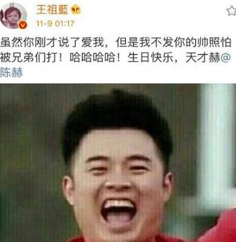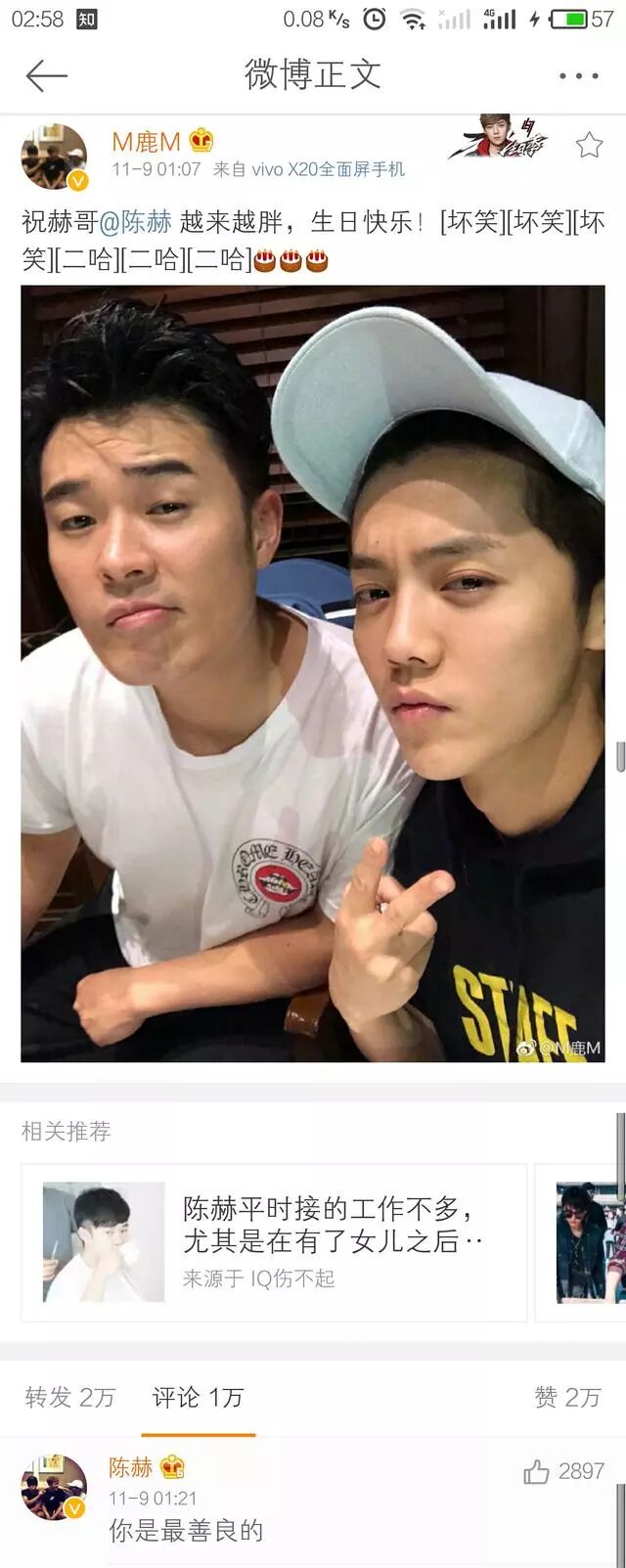 11月9日凌晨01:07,鹿晗在好朋友陈赫32岁生日之际送上“暖心”生日祝福(以及大家日思夜想的自拍一张)!贴心小棉袄鹿晗是这样祝福的:“祝赫哥@陈赫 越来越胖,生日快乐!”
