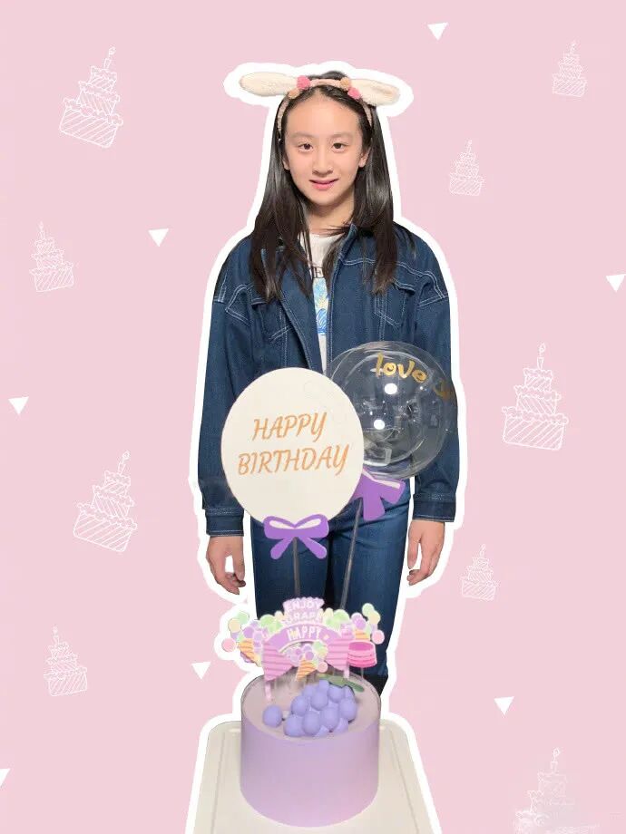 照片中森碟头戴可爱发夹,身穿牛仔衣搭配牛仔裤,秀发披肩的模样已然长成亭亭玉立的美少女。越来越漂亮的脸蛋也是和爸爸田亮超像啦。虽然有气球和蛋糕挡在前面,但是森碟高挑的身材却十分明显,尤其一双长腿相当抢镜。