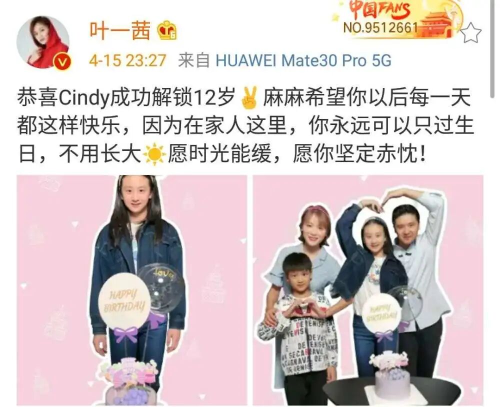 4月15日是森碟12岁生日,晚上叶一茜在社交平台晒照为女儿庆生,她写道:“恭喜Cindy成功解锁12岁 麻麻希望你以后每一天都这样快乐,因为在家人这里,你永远可以只过生日,不用长大 愿时光能缓,愿你坚定赤忱!”,字里行间可以感受到叶一茜满满的爱意。