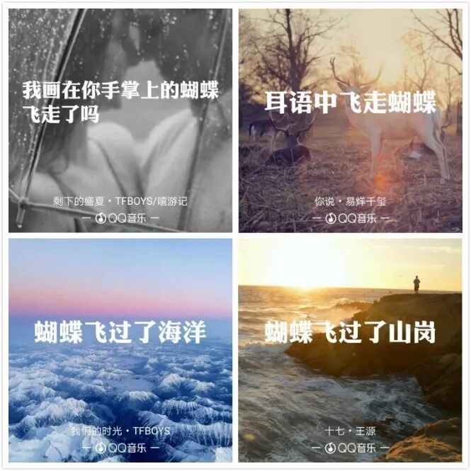 结合添福宝的四首音乐,可以连成一个很奇妙的故事:你问画在我手上的蝴蝶飞走了吗?去年冬天,他飞过了千玺的耳边,今年夏天飞过了海洋,经过了四季的更迭,时间的流逝,今年秋天,终于飞过了山岗。