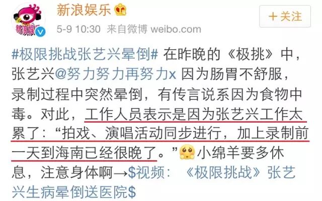 于是有人说张艺兴是因为肠胃问题晕倒的,也有说是因为食物中毒!