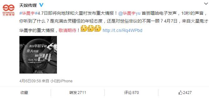 4月6日,一条“来自华晨宇的重大情报即将发声,敬请期待”的消息引爆微博,众多歌迷纷纷猜测华晨宇到底发生何事之时,特立独行的《火星情报局》主题曲来袭。这首充满“火星文”的歌曲让所有以为华晨宇只会唱摇滚和抒情的人精神一振,“原来华晨宇还这么会唱嘻哈电子”!
