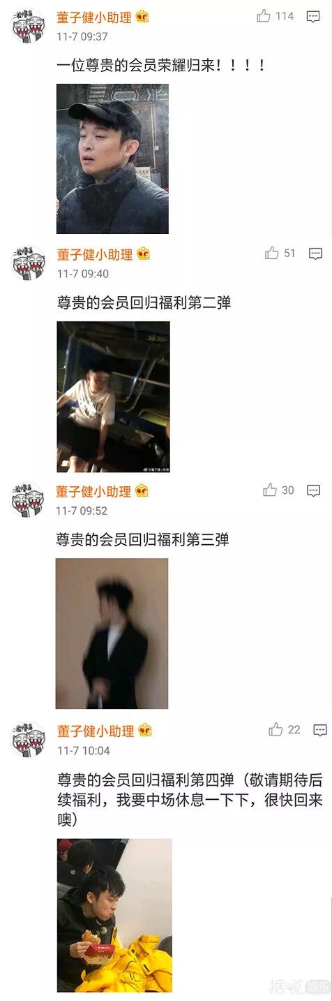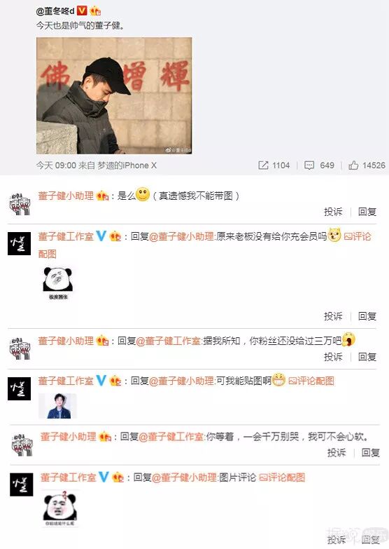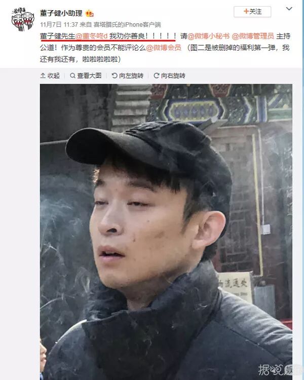 后来小助理为了证明自己的说法,给自己的微博冲了会员,在评论里连发四张董子健的丑照↓