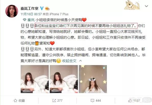 小助理说:前几天秦岚工作室已经发过声明了,不收粉丝任何礼物,只收信件。