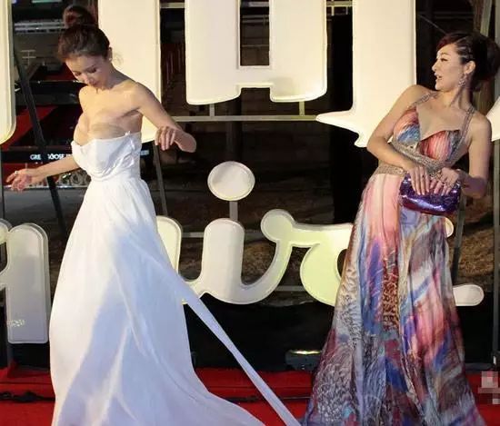 孙菲菲在走红毯的时候不小心被后面的女明星踩到裙子,结果裙子脱落
