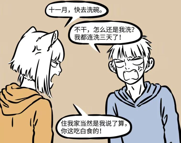 自从十一月寄宿到妹妹九月家之后,九月就非常的厌恶十一月,因为哥哥十一月好吃懒做,而且也不怎么出去工作,整天在家里玩,要不是看哥哥十一月泡面非常好吃,九月根本就不会收留他。只是一到吃完饭了,九月就忍不住指使十一月去洗碗,但是哥哥十一月不干,因为自己已经连续洗了三天了,也是时候该让妹妹九月洗碗了。可是九月不会去,在九月眼里,住我家就得我说了算,谁让十一月是吃白食的。