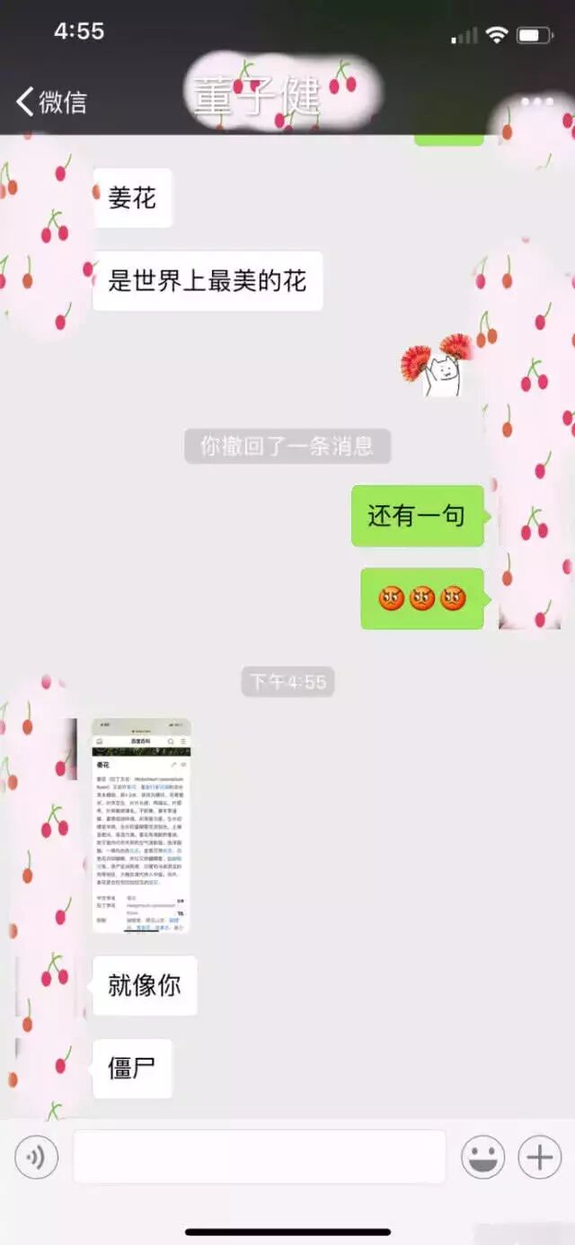 众所周知,在剧中姜花是姜声的代表之花,被誉为最美的花,没想到董子健在聊天过程中除了这句浪漫的台词之外,还称老婆是僵尸,哈哈哈,看到如此之皮的董子健,网友也是深深的为其捏了一把汗喊话董子健”给你一次机会重新组织语言“