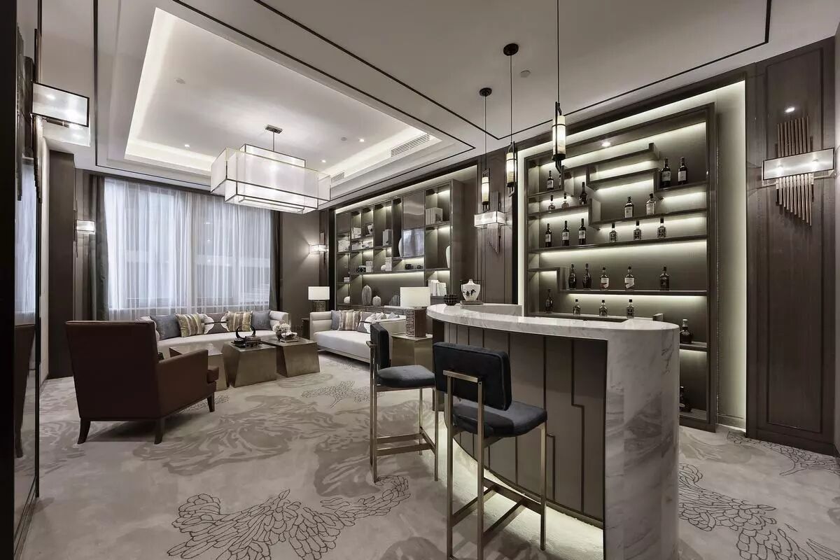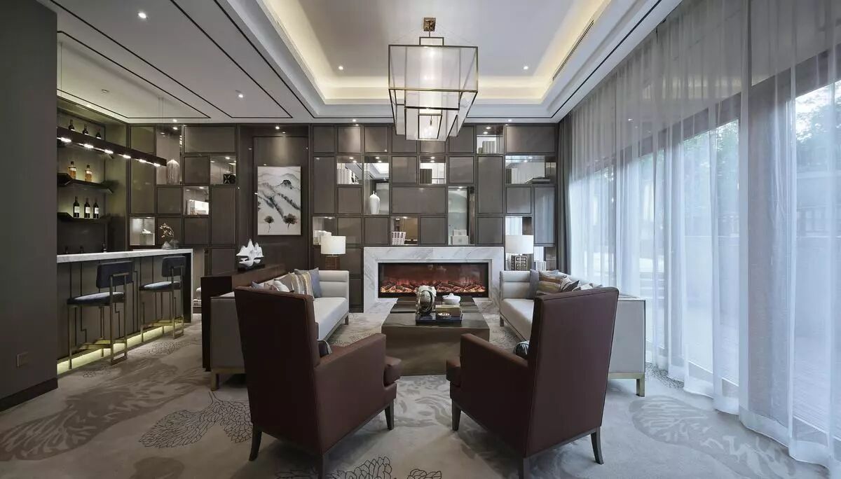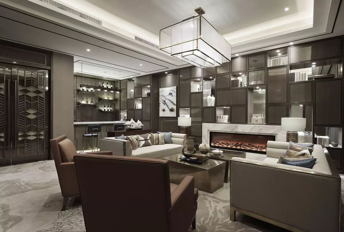 vip室用现代简约的构成手法穿插叠砌出具有中式人文气息的书墙与酒架,以灰褐、米色为色彩基调,局部点缀茶色和普兰平衡空间的视觉重感。精致大气的壁炉与红酒吧台植入东方元素,和谐互补地将东西方文化融为一体。
