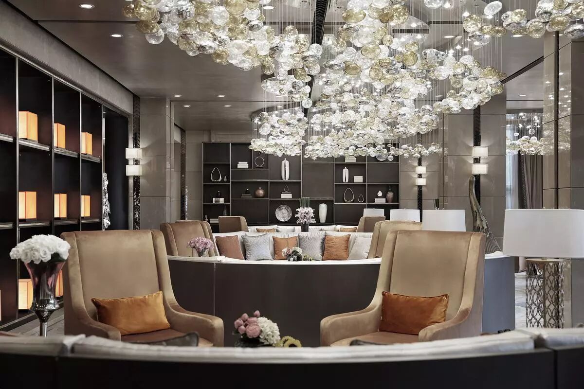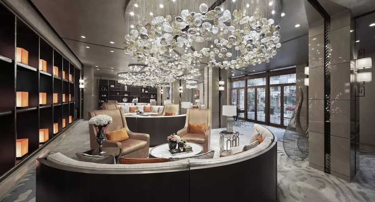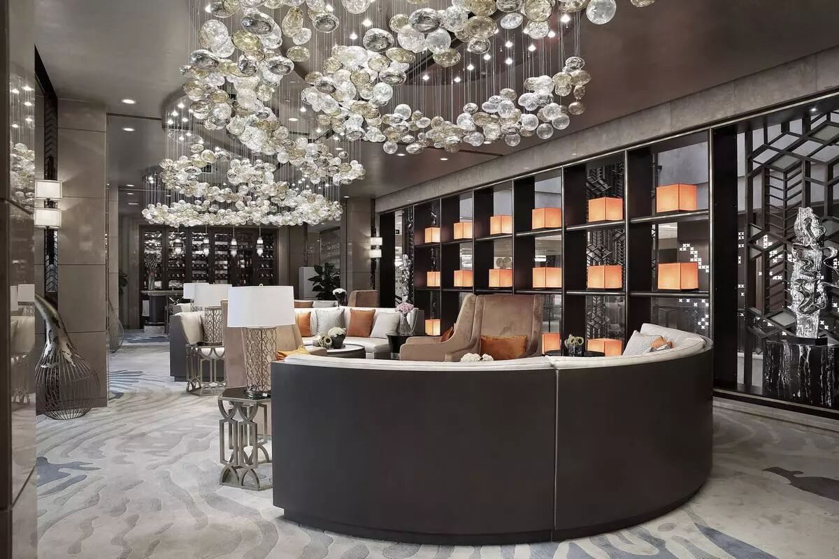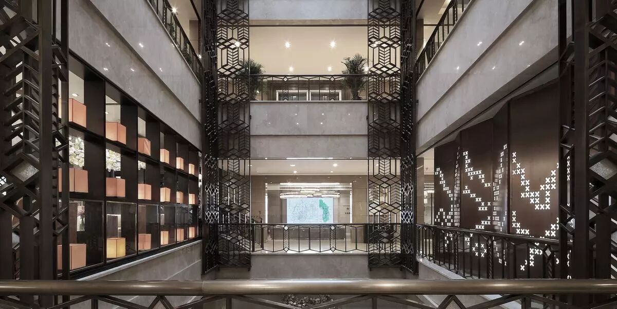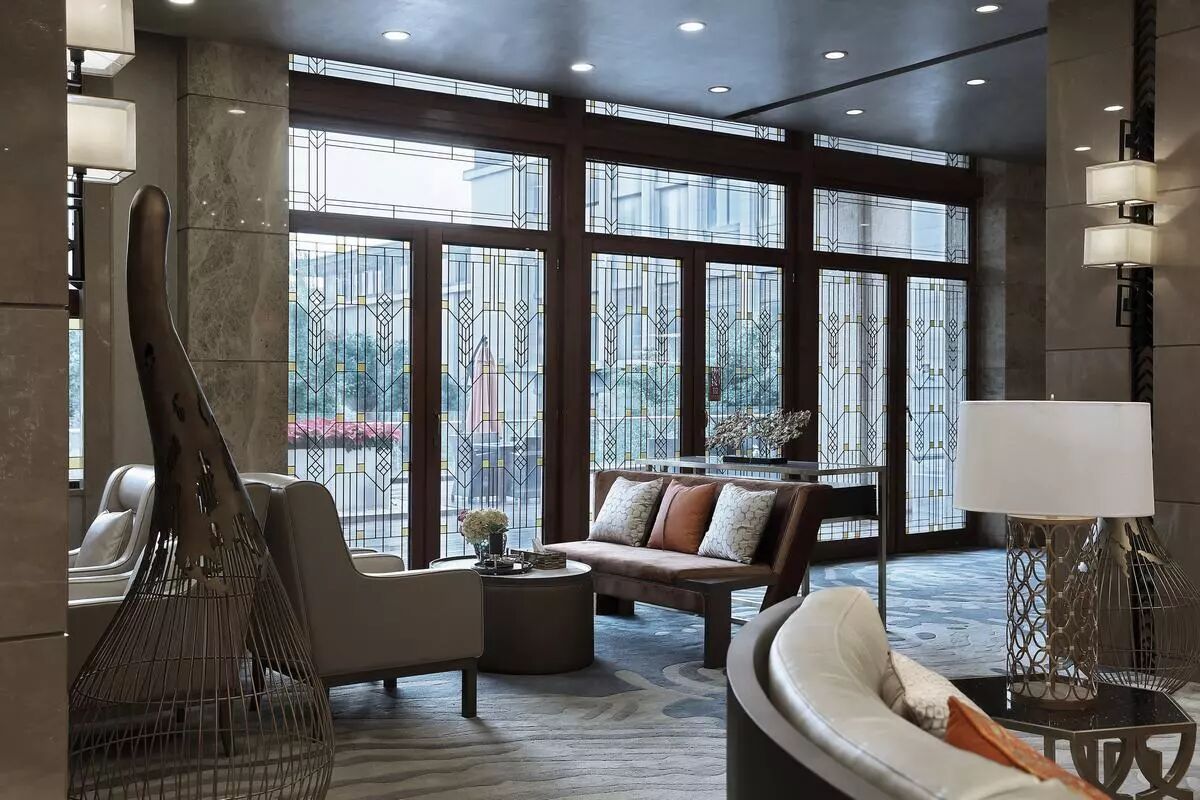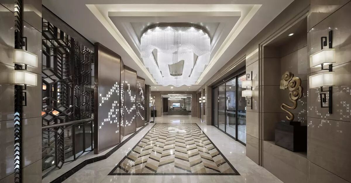 大堂入口以铜质镂空发光屏风映刻元代西山山水图,演绎出连绵起伏的山峦,时空在此交叠。并与顶部流水造型的水晶灯遥相呼应,高山峻朗如斯,流水清婉如斯,一股书香气息扑面而来。