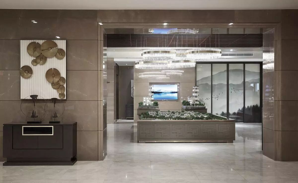 燕西华府售楼会所,延伸赖特风格的装饰手法作为骨架,同时植入东方的语境为其精神内核,两种文化在此交融,创造出稳沉与诗性的独特审美空间。