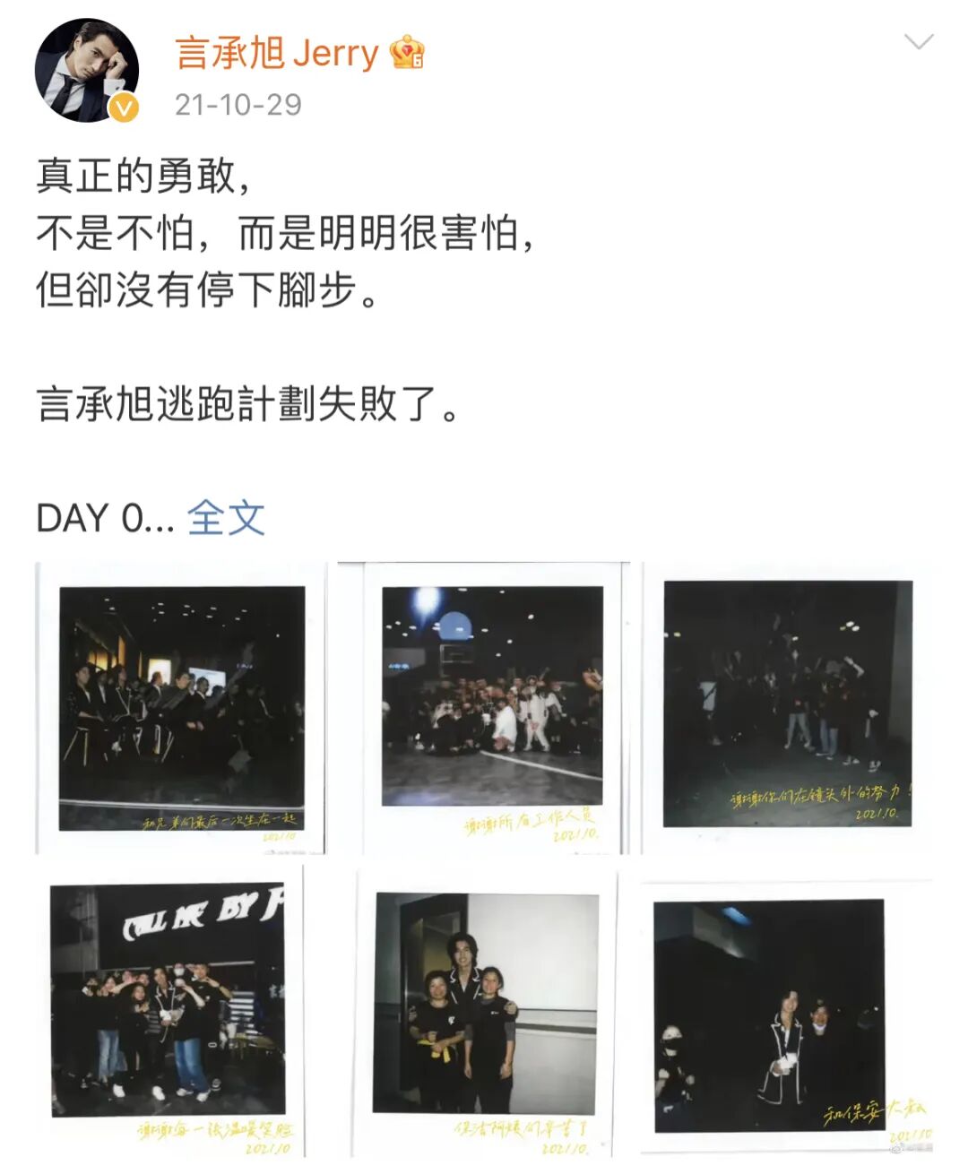 就拿言承旭告别《披荆斩棘的哥哥》时发布的长文日记来举例,六张配图有五张都是和工作人员的合影,为保护隐私,还特意模糊镜头遮挡住了工作人员的脸。