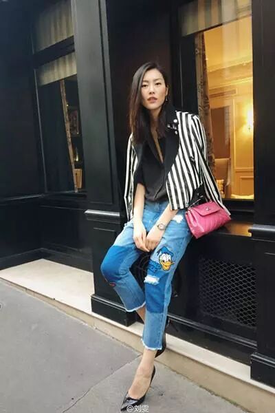 简约时尚的穿搭很有范儿呢,条纹的西服配上黑色的衬衫,中性风十足,一条拼接九分牛仔裤,加上唐老鸭的设计充满可爱,搭配粉色包包更加时尚。