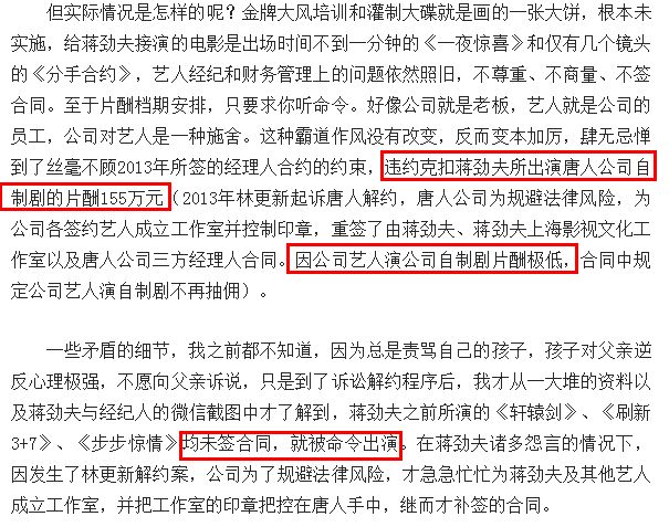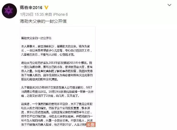 16年1月,蒋劲夫父亲控诉唐人苛刻蒋劲夫,存在压榨资源等“六宗罪”