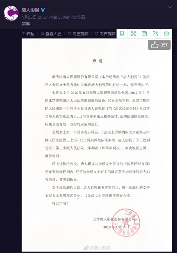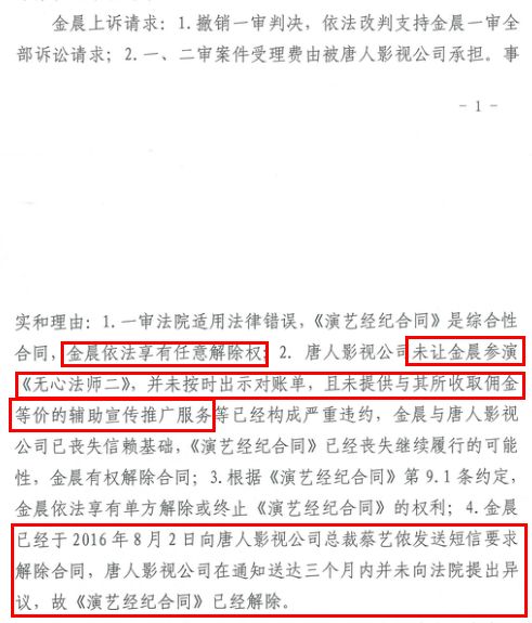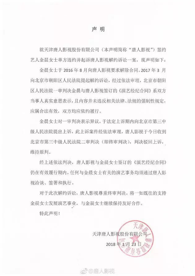 金晨在2016年8月就要求和唐人解约,但两度诉讼均未成功