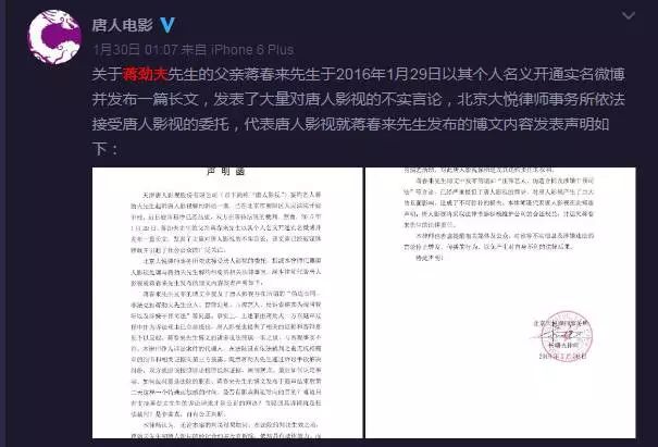 唐人公司迅速作了回应,指责蒋劲夫父亲发表的均为不实言论,甚至还起诉了蒋劲夫的父亲,要求赔偿55万的名誉损失费