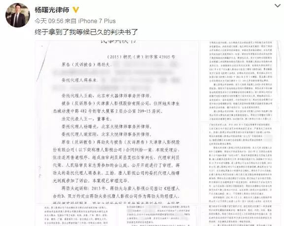 16年10月,法院判决书下来了,蒋劲夫的解约诉讼请求被驳回了,而且判决还要求蒋劲夫赔偿唐人佣金损失