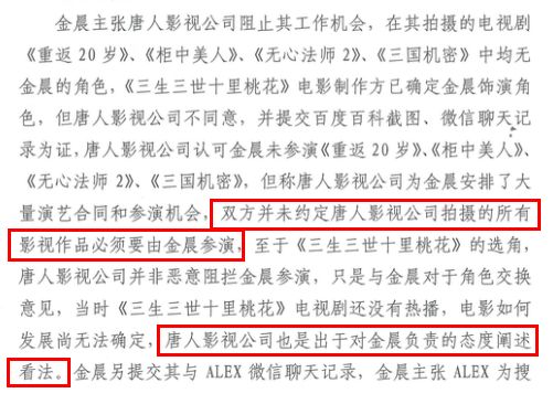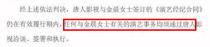 金晨说唐人没有给其足够的资源这点也站不住脚,合同里并没有规定唐人的戏金晨都要出演啊……