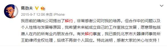 15年9月蒋劲夫就承认要解约,紧接着唐人公司方面迅速做出了回应,指出蒋劲夫在《仙剑云之凡》开机之前辞演