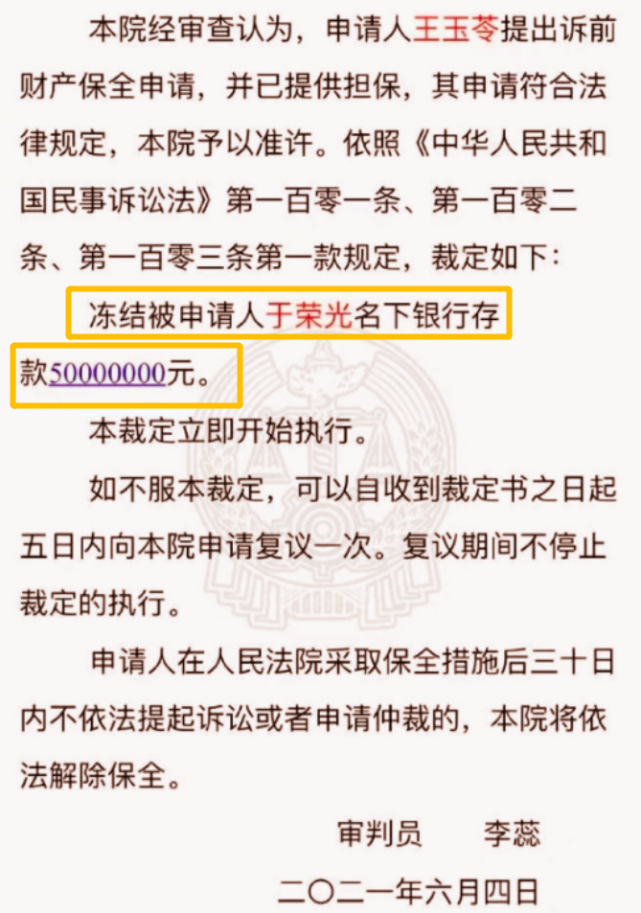 2021年6月4日,始终坚持要离婚的王玉苓,向北京市丰台区人民法院申请了对于荣光财产冻结。