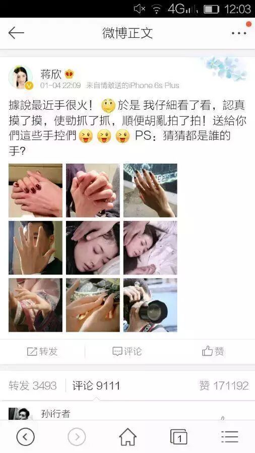 这篇文章要引出的其实是件旧事,那就是,蒋欣和王凯正在热恋! 4月12日凌晨,娘娘连发两条微博晒出了四张与演员王凯的亲密合影,合照中王凯搂住娘娘的脖子,两人头碰头,笑容温馨甜蜜,cp感十足。蒋欣还配文“他说他爱我”,“這樣真的不會被打嗎?”并@了王凯。 网友纷纷评论道:“哎,一看就知道我老公又喝大了..娘娘对不住了,我这就领他回家”、“我最喜欢的男人和女人抱在了一起…还有比这个更伤人的吗”、“人家真的在微博公布恋情,大家严肃点…都睡一起了…大半夜的”。 对蒋欣王凯来说这是一个嗨到天亮的夜晚,而两人的粉丝也表示是个“不眠之夜”。不过也有不少“正午”粉淡定表示“这只是欢乐颂剧组聚餐,大家别激动,洗洗睡吧”“ 午夜月光剧组又上线了,逢奖必聚,逢聚必喝,逢喝必嗨,乃此剧组之迷之特色,一贯如此!” 目前这条微博一经被删除,至于娘娘删除这条微博的动机,尚不可考。 剧情扑朔,目前来说,当事双方是不可能回应的。但是!接下来的分析,请你一定要认真看,这些蛛丝马迹透露了,他们两个确实在一起了! 毕竟,在别人的微博里,他们已经是这样的了。。。 牵手照片 发布会粉红 3.情侣装 我们就坐等公开吧~露出的西装袖口明明就是wuli凯凯王!