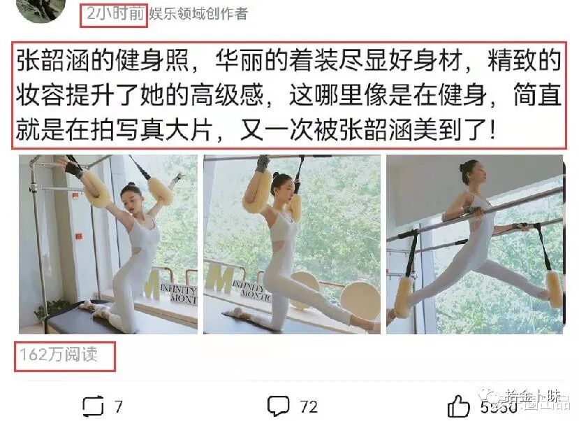 从该娱乐博主晒出的这一组张韶涵的健身照来看,这并不是张韶涵近期拍摄的健身照,而是一组张韶涵以前拍摄的健身照,虽然是一组张韶涵的旧照,但是依然热度很高,2个小时阅读量就超过了160万,评论数高达72条,很显然,这一组张韶涵健身的照片火了,并且引起了网友们的热议。